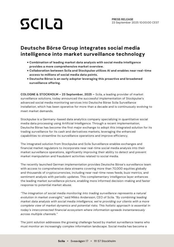 COLOGNE & STOCKHOLM – 23 September, 2025 – Scila, a leading provider of market surveillance solutions, today announced the successful implementation of Stockpulse’s advanced social media monitoring services into Deutsche Börse Scila Surveillance installation, which has been operative for more than a decade and is continuously evolving to meet market demands.